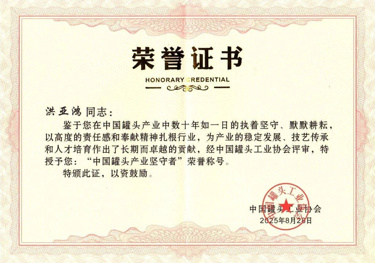 洪亞鴻憑借對(duì)行業(yè)的十年如一日的堅(jiān)守耕耘、卓越貢獻(xiàn),被協(xié)會(huì)授予“中國(guó)罐頭產(chǎn)業(yè)終身成就”與“中國(guó)罐頭產(chǎn)業(yè)堅(jiān)守者”兩項(xiàng)榮譽(yù)稱號(hào)。